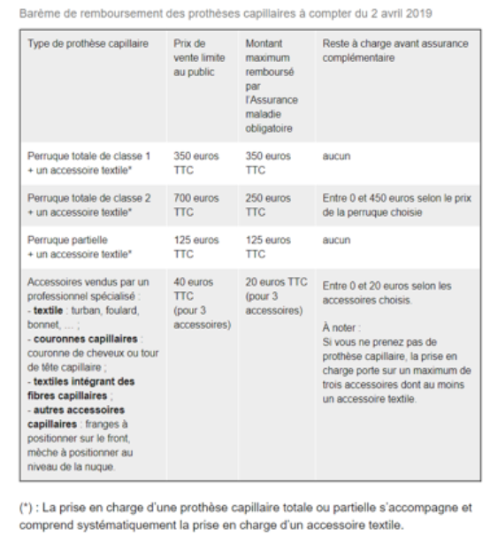 À compter du 2 avril 2019, les perruques de classe 1 (cheveux synthétiques avec une zone de 15 cm2 minimum de cheveux exclusivement implantés manuellement) sont remboursées intégralement avec un prix de vente limite au public de 350 €. Les perruques de classe 2 (implantation de cheveux naturels sur 30 % de la perruque au minimum ou cheveux synthétiques avec une zone de 30 cm2 minimum de cheveux exclusivement implantés manuellement) sont remboursées à hauteur de 250 € avec un prix de vente limite au public fixé à 700 €. Quant aux prothèses capillaires partielles, le tarif de remboursement et le prix de vente limite au public sont plafonnés à 125 €.